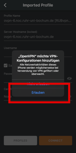 - Geben Sie als Username Ihre LoginID ein. Die Verbindung kann jetzt über den Button Connect hergestellt werden. Ggf. werden Sie noch aufgefordert die Änderungen zu erlauben.
